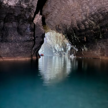 One of the most remarkable experiences in Chympe is exploring its cave system. The journey begins in an unusual way — not by walking in, but by gliding on a bamboo raft or boat across still waters, into the mouth of the cave.