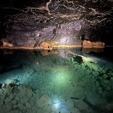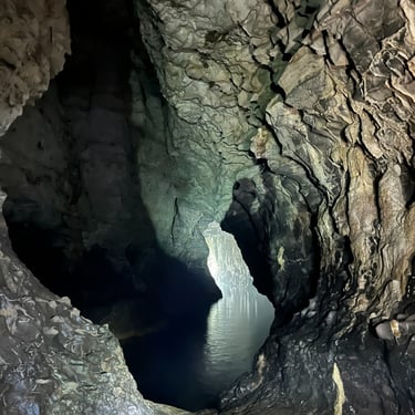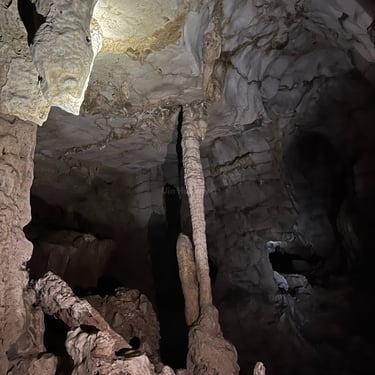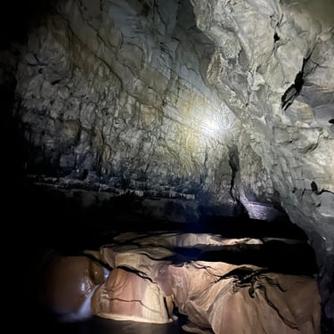 The air inside is cool and damp, the walls alive with patterns carved by nature over centuries. Stalactites and stalagmites glisten under the glow of headlamps, casting shadows that make the cave feel alive.